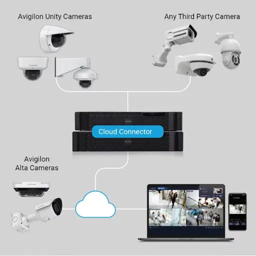 - Connexion directe aux caméras cloud-native ou via l'ONVIF avec le Cloud Connector